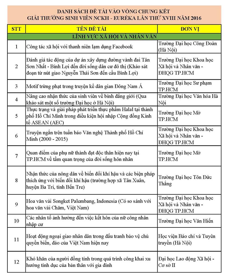 Ban tổ chức Giải thưởng Sinh viên Nghiên cứu Khoa học Euréka lần thứ XVIII năm 2016 công bố danh sách 114 đề tài của 11 lĩnh vực đến từ 53 trường trên toàn quốc vào Vòng chung kết Giải thưởng năm nay. Trong đó có 1 đề tài của sinh viên Trường Đại học Văn Hiến vinh dự được lọt vào vòng chung kết Giải thưởng.